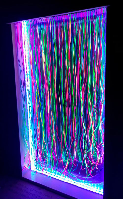 Настенное панно со светящимися в УФ излучении шнурами на фоне небъющегося зеркала. ПВХ шнуры засвечиваются по всей длине в полной темноте, цвет каждого меняется на всем протяжении. Короб полностью закрыт, нити зафиксированы. Источник света - лента с безопасным напряжением в 12 вольт.