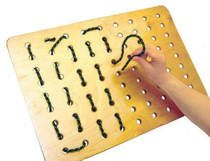 Суть занятий состоит в продевании разноцветных шнурков в отверстия панели, что обеспечивает отличную тренировку кистей рук .