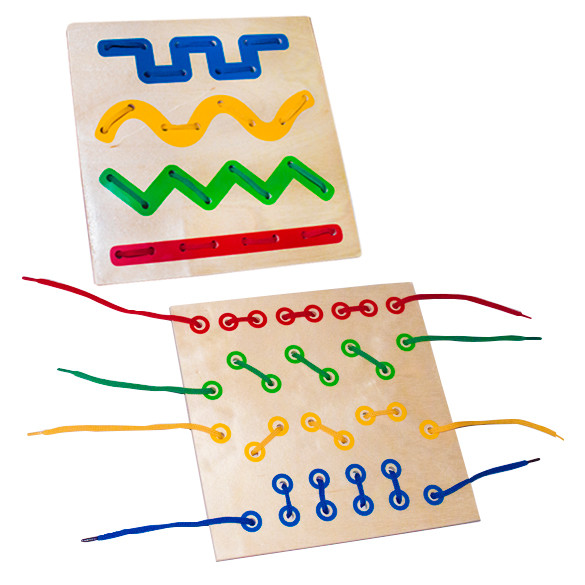 На одной стороне 4 разных по форму и цвету линий с отверстиями, через которые необходимо протянуть шнурок и повторить рисунок. С обратной стороны цветами отмечены отверстия, прошнуровав отверстия одного цвета получится линия. Материал: фанера