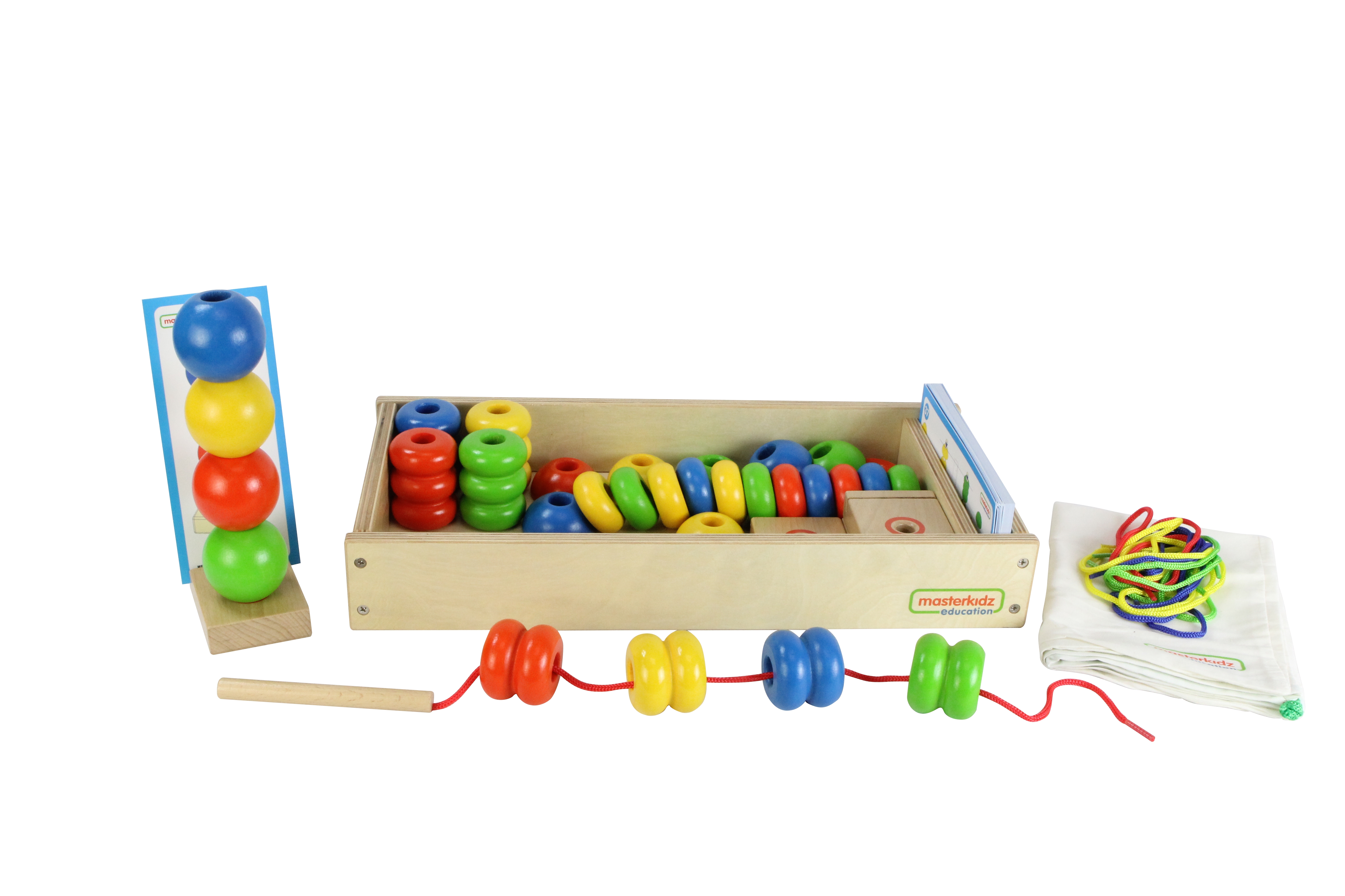 В набор входят разноцветные бусинки и шнуровки, а также 4 прозрачные пластиковые трубки для укладки бусинок. Бусинки имеют разную фому. Трубки с маркировкой, что облегчает для детей количественную оценку высоты каждой бусинки или комбинаций из них. Набор поставляется в прочном деревянном ящике для хранения.
