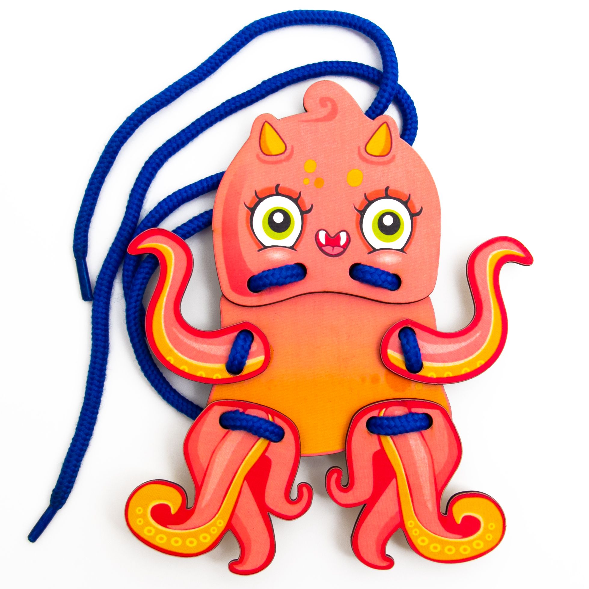 2. Предложите ребенку расположить детали (части игрушки) на ровной поверхности (стол, диван, ковер, пол). Затем попросите сложить в нужном порядке так, чтобы получился герой - Чуда Юдишна. Далее, после того как ребенок составил верно осьминожка, попросите соединить детали шнурком, могут быть разные вариации. Если ребенку сложно это сделать самостоятельно, помогайте и демонстрируйте, как это должно быть.