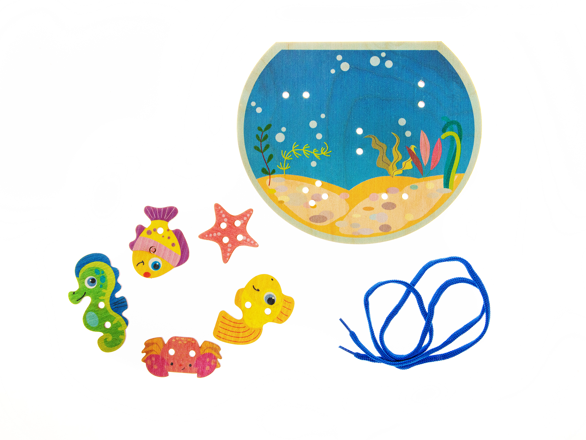 Оригинальная деревянная шнуровка, выполненная в форме аквариума с обитателями, подарит малышу массу положительных эмоций и позволит непоседе от 3-х лет в процессе этой увлекательной игры развить мелкую моторику, внимание, логическое мышление, координацию движения рук, укрепить мускулатуру пальчиков.