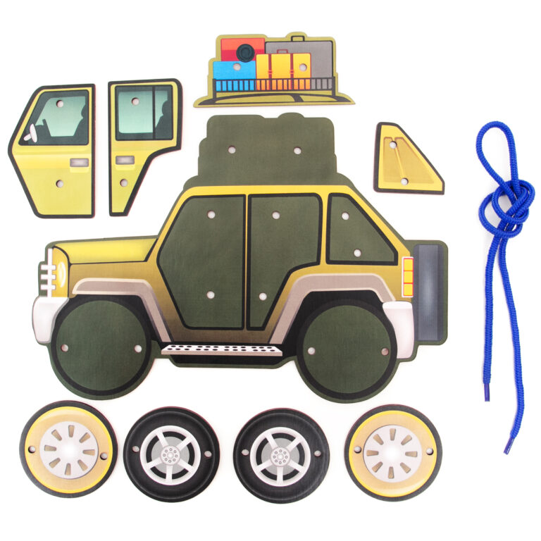 Деревянная панель в виде машинки с отверстиями для продевания шнурка – 1 шт.;