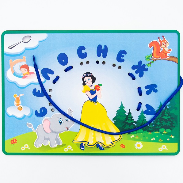 После того, как вы внимательно рассмотрели игру, находите с ребенком рисунок и ищите ему буквенное соответствие в слове БЕЛОСНЕЖКА. Слова составляются путем последовательного продевания шнура через дырочки соответствующих букв. Разберите все слова, представленные на картинках.