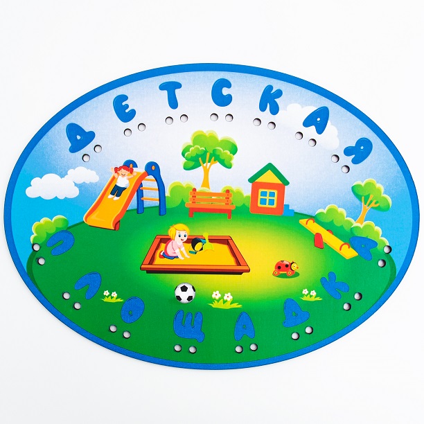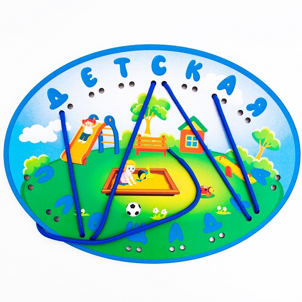 Деревянная панель с изображением детская площадка на улице и по краю панели располагается надпись ДЕТСКАЯ ПЛОЩАДКА. У каждой буквы по два отверстия. Два шнурка.