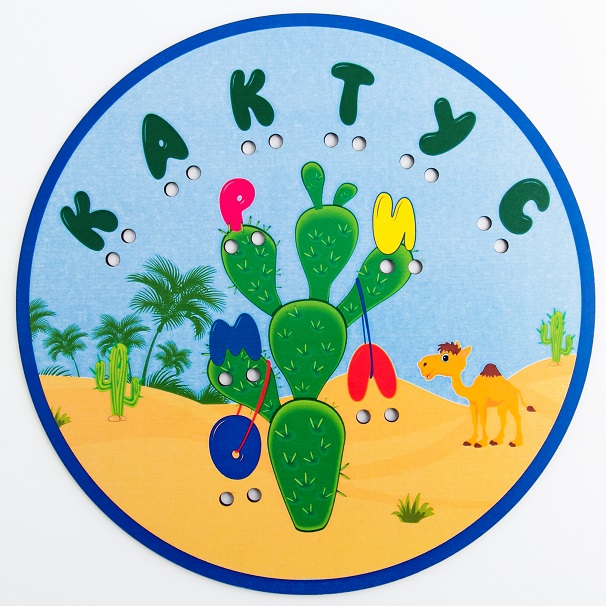 Деревянная панель с изображением пустынного пейзажа и кактуса в верхней части надпись КАКТУС. У каждой буквы по два отверстия. Шнурок.