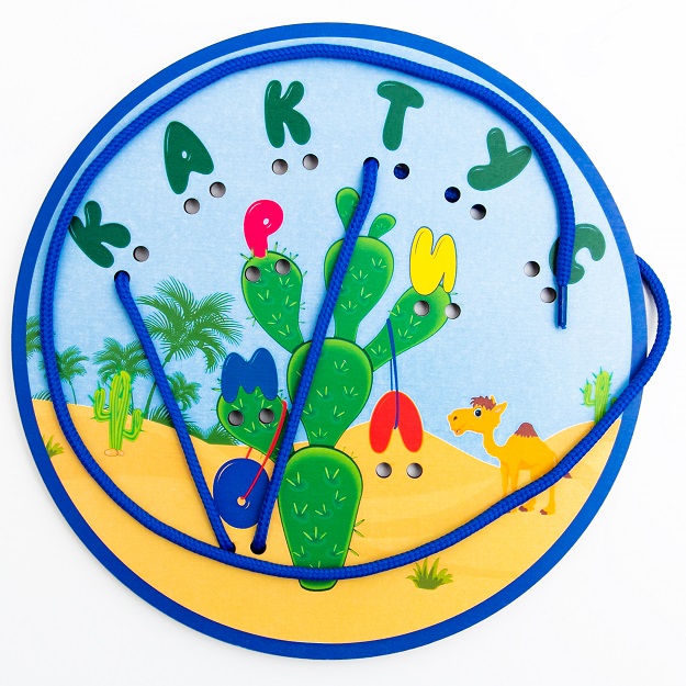 2 вариант: Ребенок продевает в первое отверстие первой буквы, взрослый произносит букву. Ребенок выводит шнур во второе отверстие и произносит букву К. Продолжаем вводить шнур в следующее отверстие взрослый называет букву, ребенок повторяет следующую букву А. Выводя шнур ребенок соединяет первый и второй звук слитно - КА. И так далее. Продевая шнур в первое отверстие он повторяет букву за взрослым, выводя шнур во второе отверстие соединяет ранее произносимые звуки. И к последней букве С ребенок произнесет слово КАКТУС целиком.