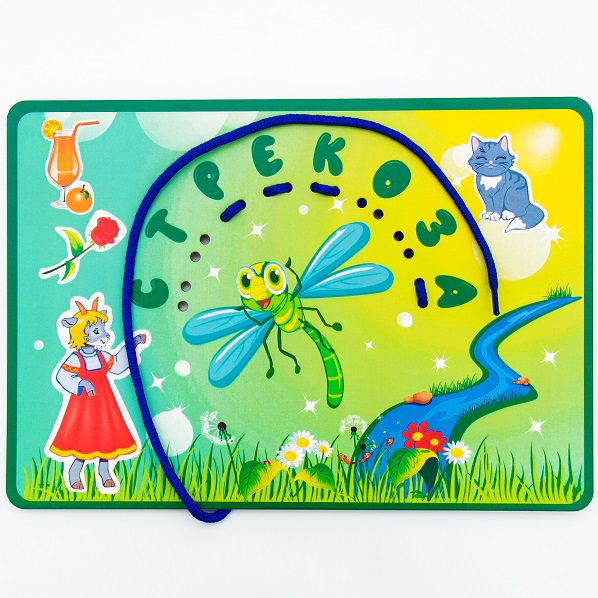 После того, как вы внимательно рассмотрели игру, находите с ребенком рисунок и ищите ему буквенное соответствие в слове СТРЕКОЗА. Слова составляются путем последовательного продевания шнура через дырочки соответствующих букв. Разберите все слова, представленные на картинках.