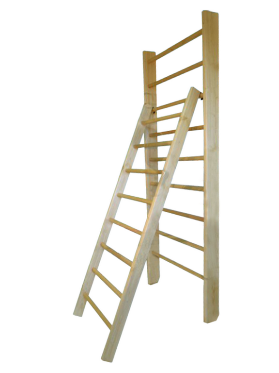 Габаритные размеры лестницы: высота 2400 мм, ширина 400 мм, ширина боковой доски 120 мм. Стальные крючки для навешивания на шведскую стенку. Покрытие лак на водной основе.