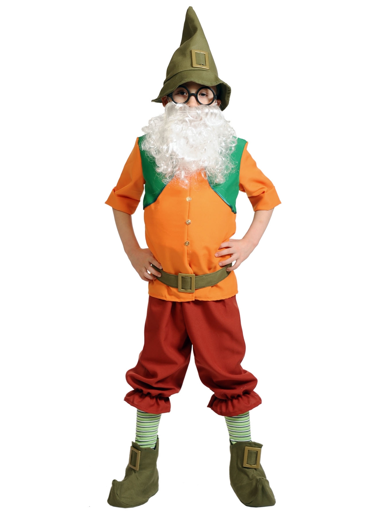 колпак, борода, рубаха с накладным животом, пояс, бриджи,сапожки, гетры, очки
