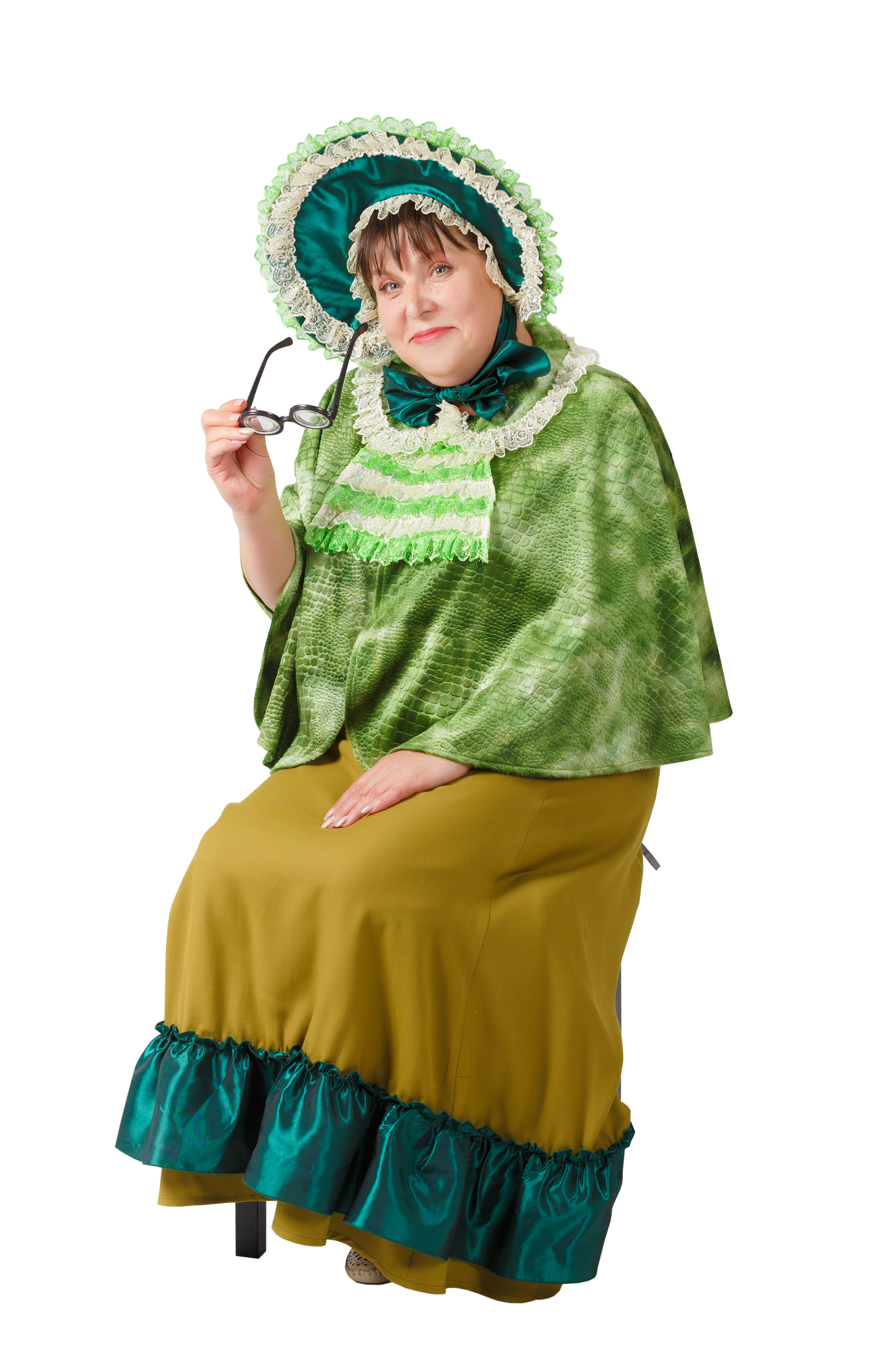 зелёный комплект: головной убор, жабо, накидка, юбка