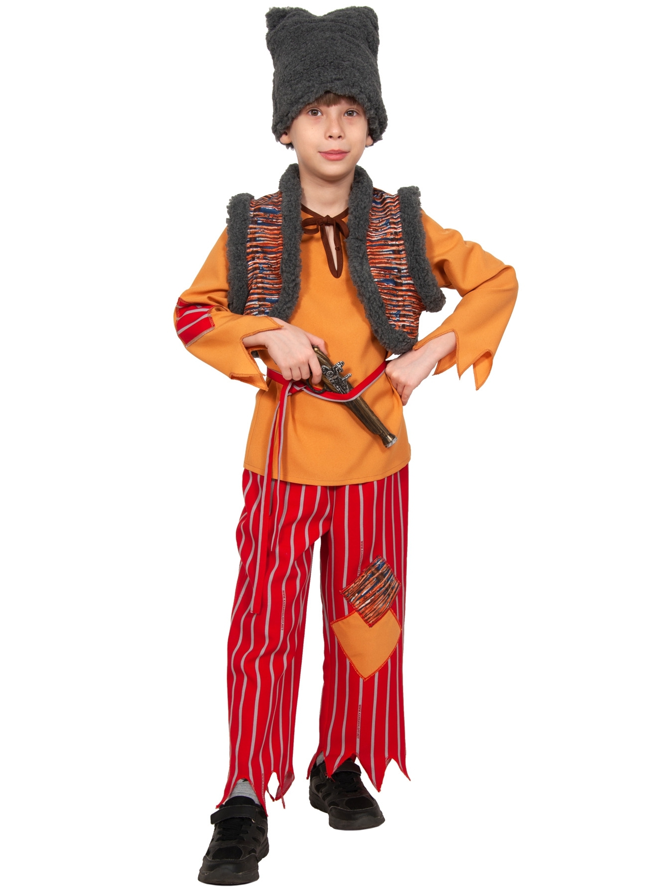 шапка-папаха, рубаха, штаны, жилет, мушкет, пояс