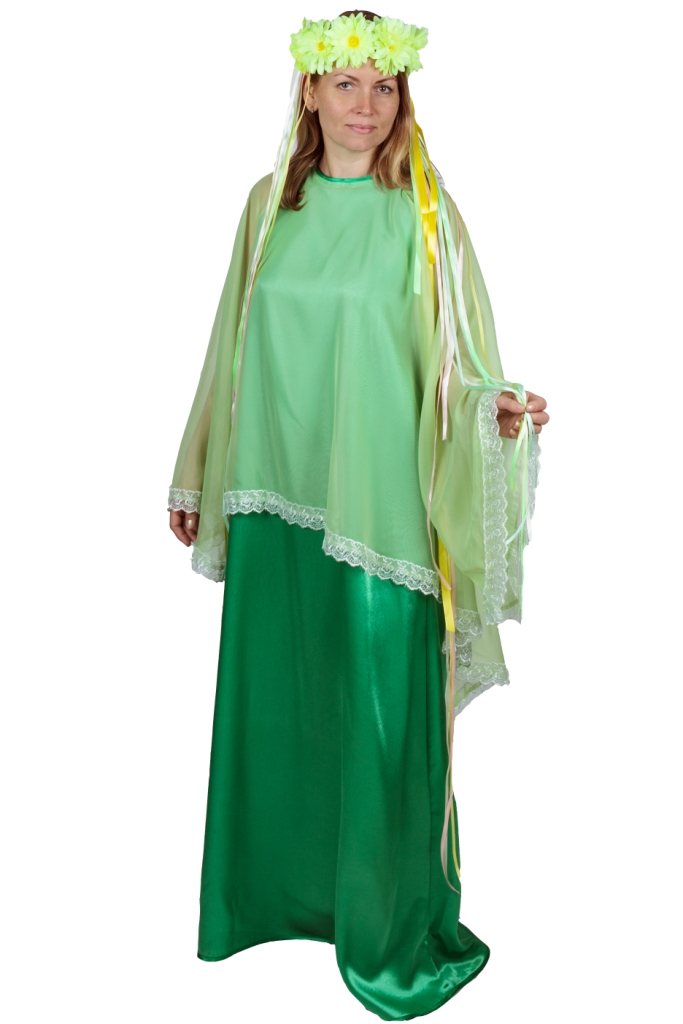 Размер: длина изделия 145 см, ширина в области груди 120 см, длина рукава 74 см, ширина рукава под проймой 64 см, венок: длина ободка 54 см, ленты длиной от 75 до 120 см.