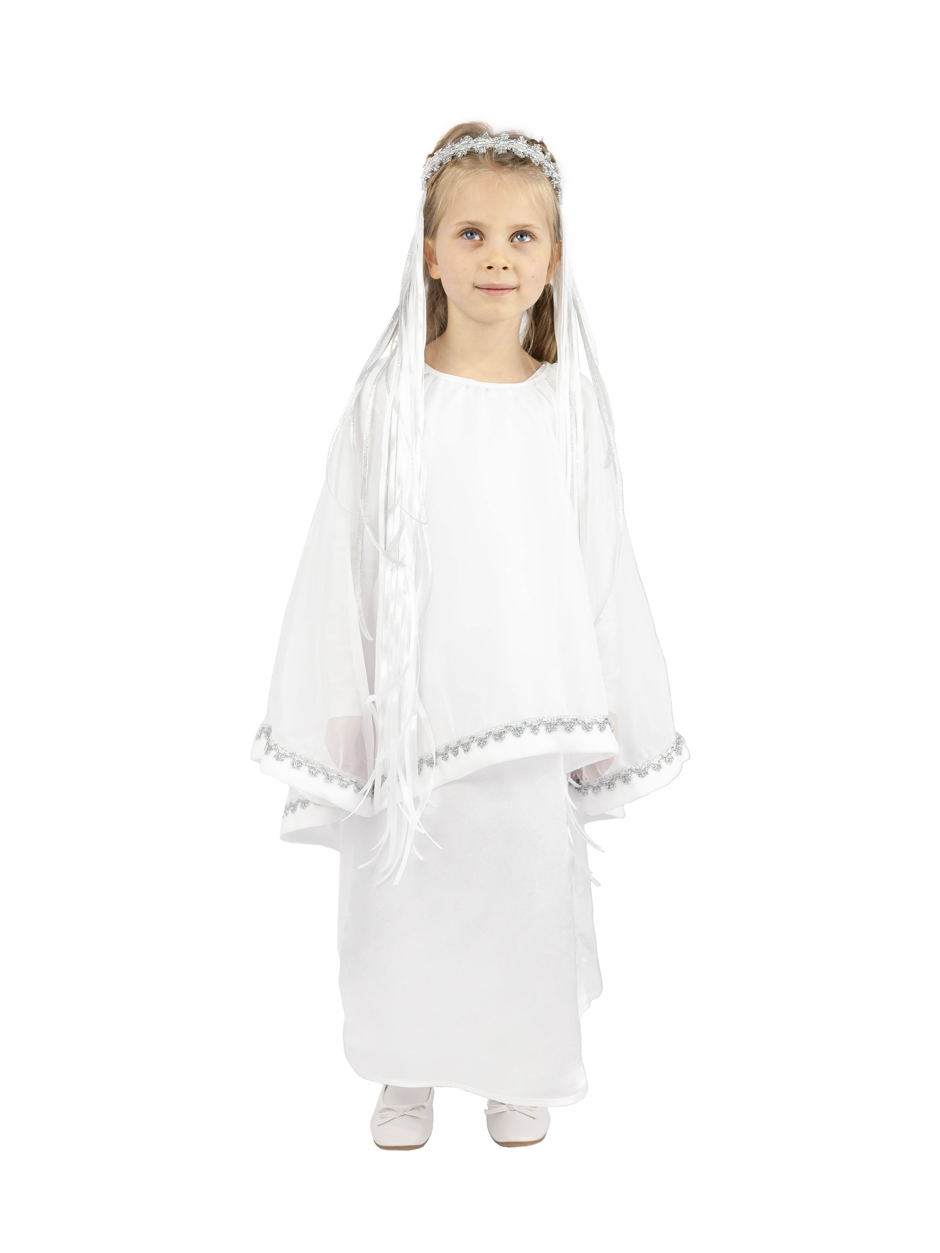 Материал: крепсатин, вуаль, атласные ленты ширина 12 мм и 6 мм, искусственные цветы, регилин, кружево, окантовочная лента. Комплектация: платье с длинным рукавом, по низу накидки и по низу рукавов — кружево, застежка сзади на пуговку, головной убор — венок с лентами и искусственными цветами.