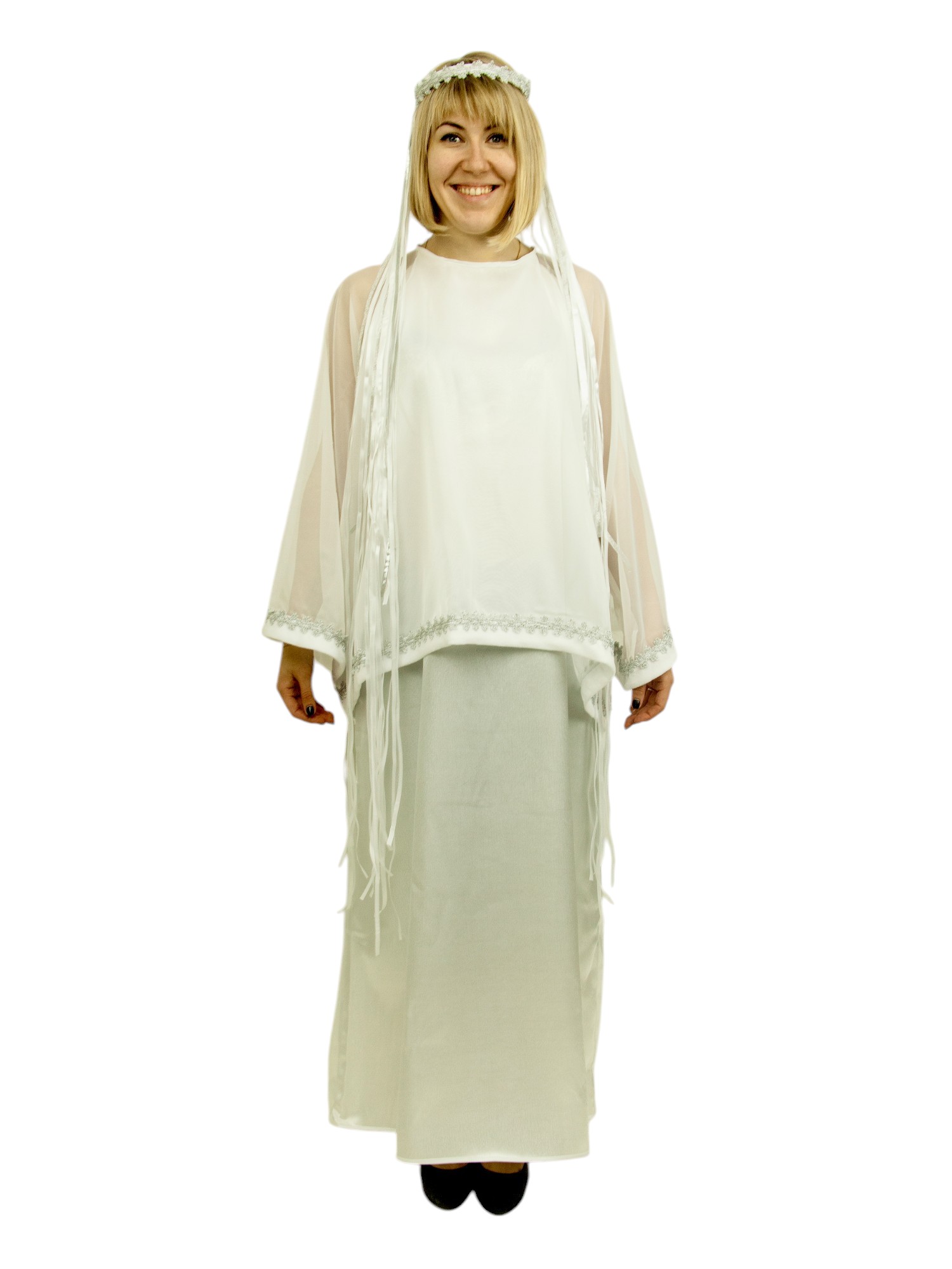 Размер: длина изделия 145 см, ширина в области груди 120 см, длина рукава 74 см, ширина рукава под проймой 64 см, венок: длина ободка 54 см, ленты длиной от 75 до 120 см.