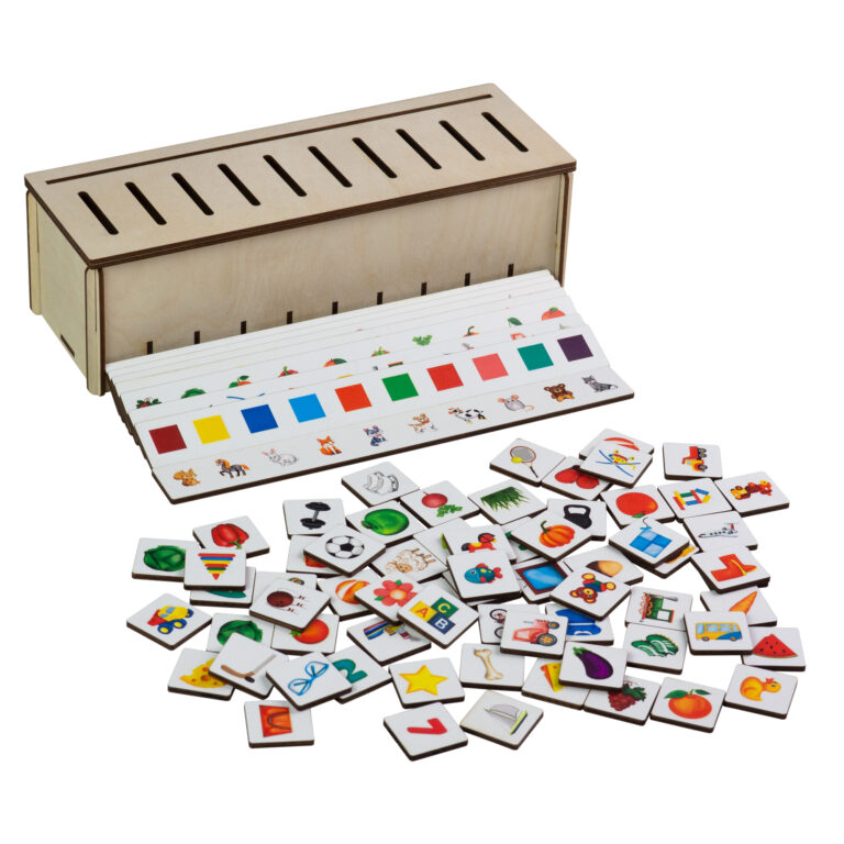 Ящик с перегородками – 1 шт. Крышка на ящик с прорезями для опускания фишек - квадратиков с изображением различных предметов и цифр – 1 шт.