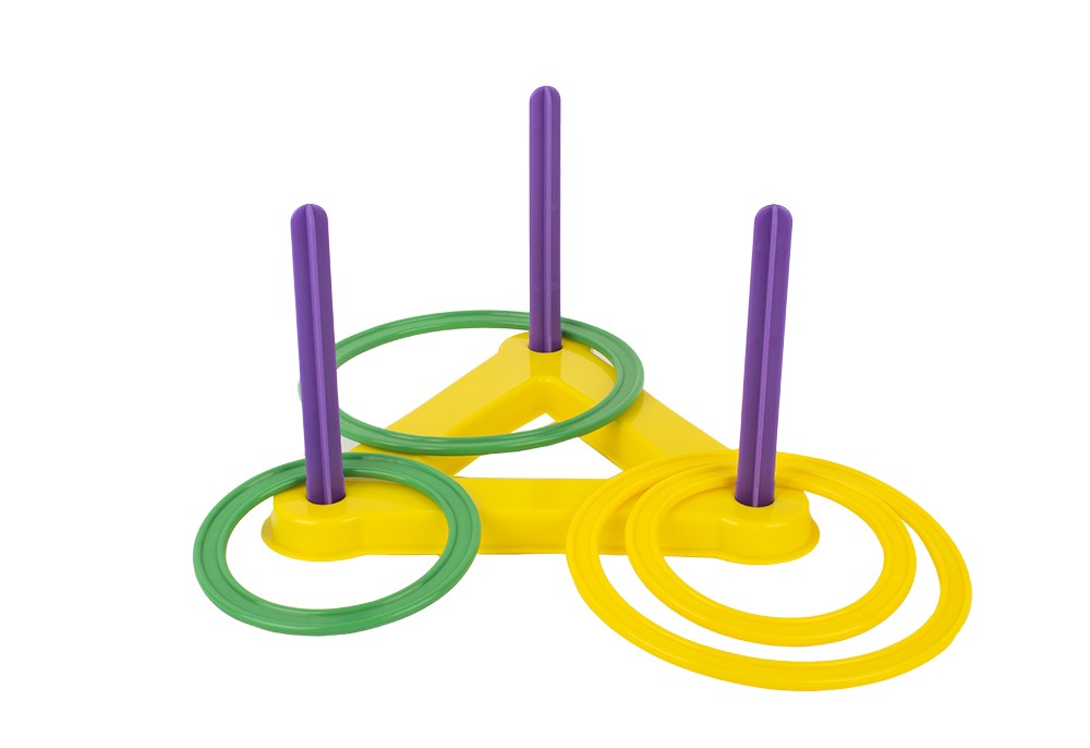 Игра "Кольцеброс" ( основание, стойка 3шт., кольцо 4 шт.) изготовлена из пластмассы. Цель игры - набрасывать кольца на стойку с определенного