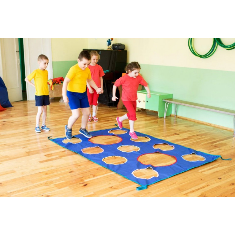Командная: полотно опускается двумя участниками на уровень щиколоток(или полотно кладут на пол). Участники каждой команды должны перейти по отверстиям с одной стороны полотна на другую сторону. Можно играть одной командой на выбывание из команды человека наступившего на полотно;