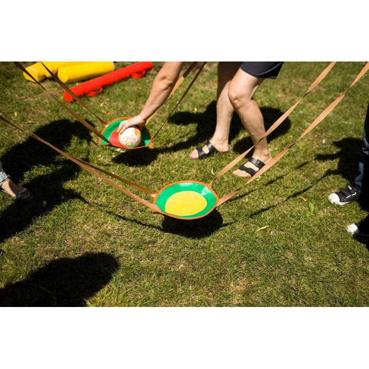 Игроки натягивают шнур во всю длину, мяч кладется в центр мишени и дети должны перебросить его своим соперникам, так чтобы он не упал.