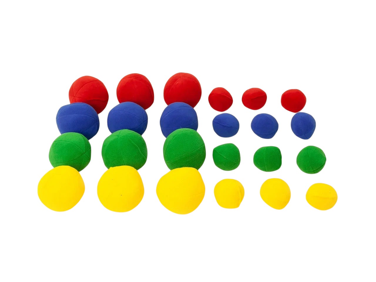 Комплектация: мячики мякиши - 2-х размеров 4-х цветов по 3 штуки каждого вида. Всего 24 штуки. Мешок для хранения - 1 штука.