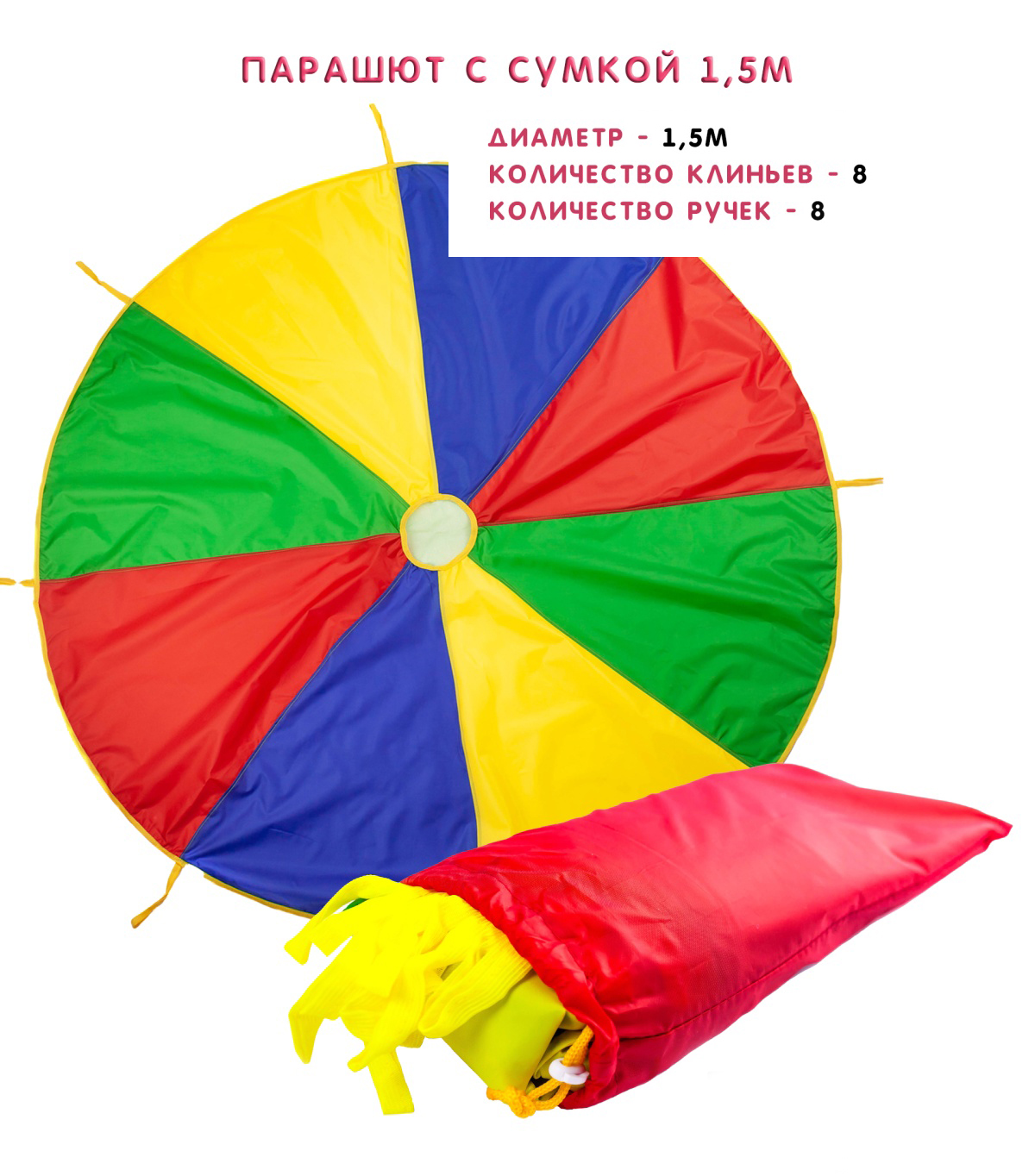 1. Парашют, состоит из 8-ми клиньев 4-х цветов: синий, красный, желтый, зеленый, по окружности пришиты 8 ручек, в центре парашюта - сетка.