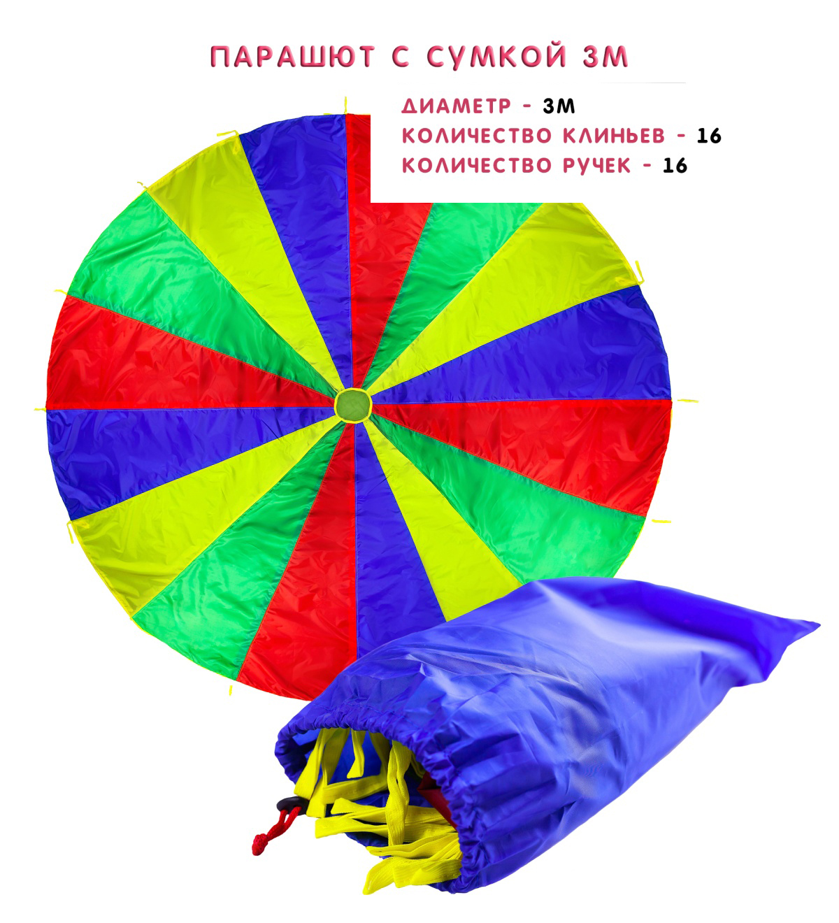 Комплектация: парашют, сумка для хранения. Парашют состоит из 16-ти клиньев 4-х цветов: синий, красный, желтый, зеленый, по окружности пришиты 16 ручек, в центре парашюта - сетка.