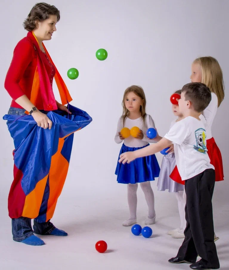 С такими штанами можно придумать очень много веселых игр. Игра "Полные штаны шаров". Детям предлагается закидывать в штаны аниматору, разбросанные по залу, шары от сухого бассейна. Аниматор подставляет обруч, так чтобы шарики попадали в штаны. Можно закидывать маленькие воздушные шарики. Очень весело и зрелищно!