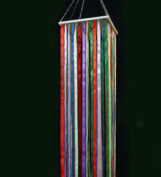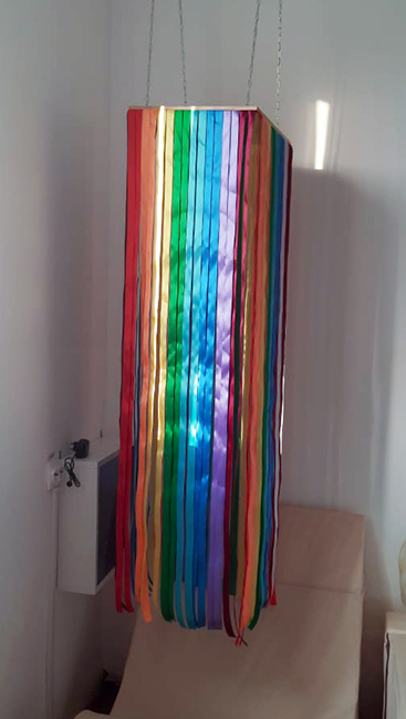 Сухой душ из атласных лент. Стандартный размер основания 40х40 см., на нем закреплено безопасное акриловое зеркало. Длина лент 150 см. Ширина лент 2 см., кол-во 64 штуки. Разноцветные ленты гладкие на ощупь, их очень приятно перебирать в руках.