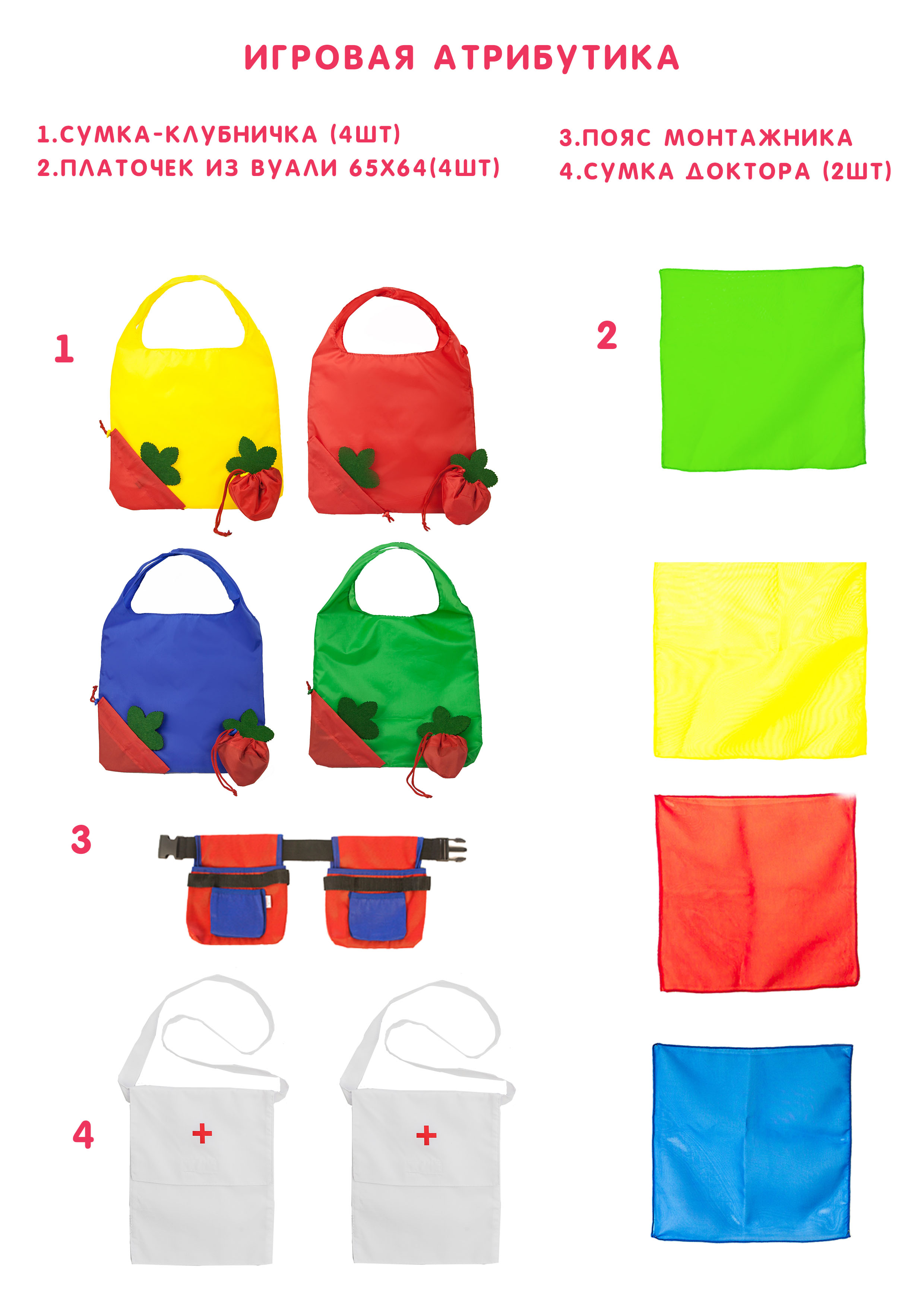 Сумки – клубнички 4 шт (синий, красный, желтый, зеленый), сумка доктора 2 шт, пояс монтажника, платочек из вуали 65х65 см (синий, красный, желтый, зеленый)
