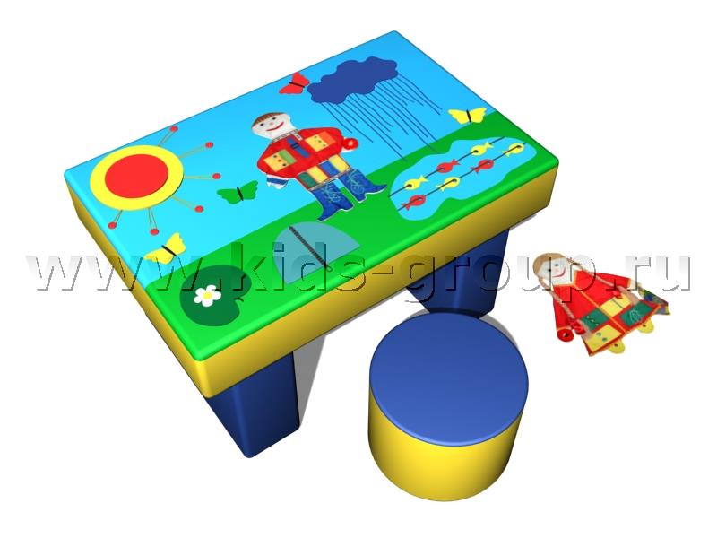 Комплектация стола: Дидактическая столешница 50/90/10см (в комплекте дидактический Данилушка или Марьюшка на липе), 4 бабочки, озеро с рыбками на шнуровке, облако с дождиком, солнышко с лучиками на резинке, лягушка под листом, зайка в норке, 3 опоры 40*50*10см Банкетка д30/30 см