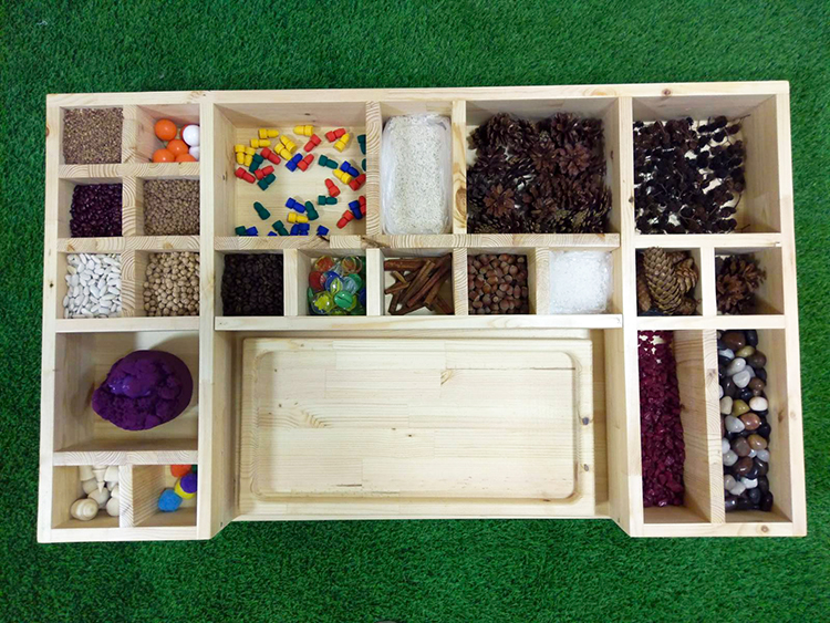 Стол из натурального дерева разбитый на 22 ячейки различных форм. В каждой из которых - наполнители различных форм, фактуры и цветов. Используется в работе психолога, творческих мастерских, реабилитации пациентов с различными расстройствами.