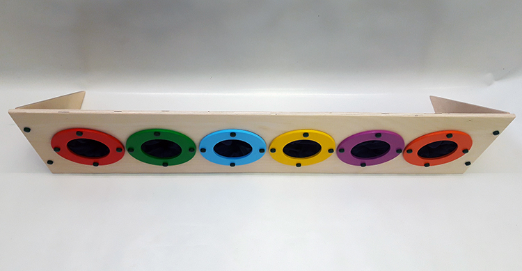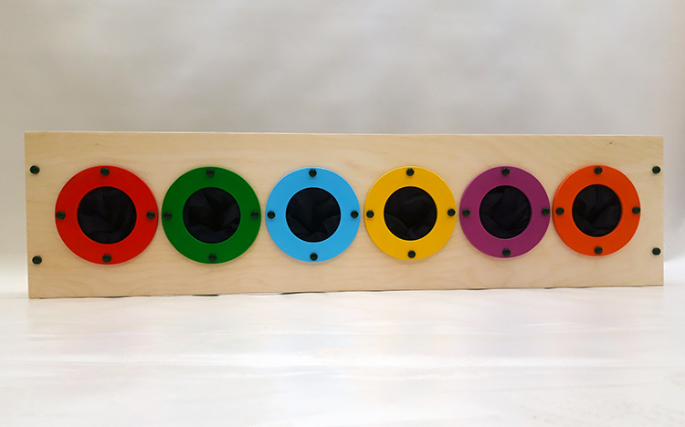 Настенный модуль (может использоваться как настольный) состоящий из деревянной основы и шести вмонтированных тактильных мешочков. Текстиль мягкий, бархатистый и очень приятный на ощупь. Каждая ячейка обозначена контрастным кругом яркого цвета.