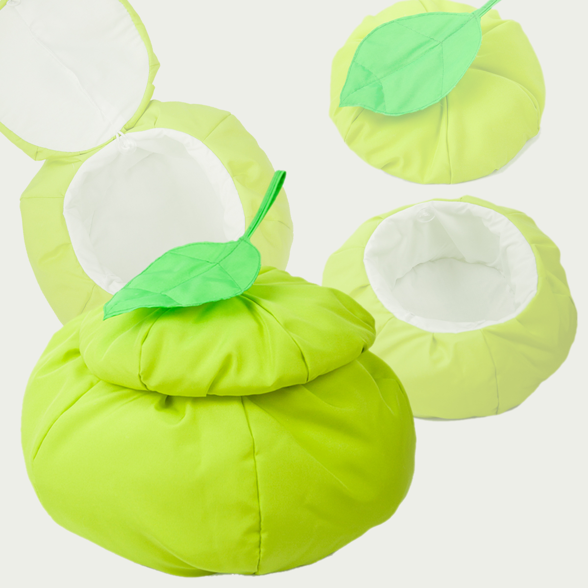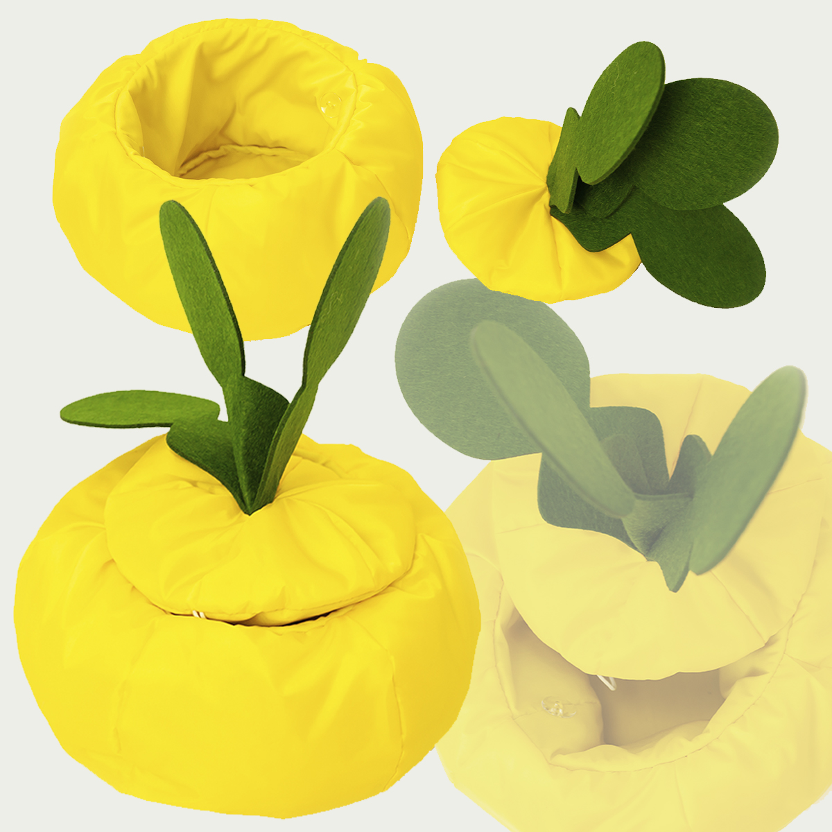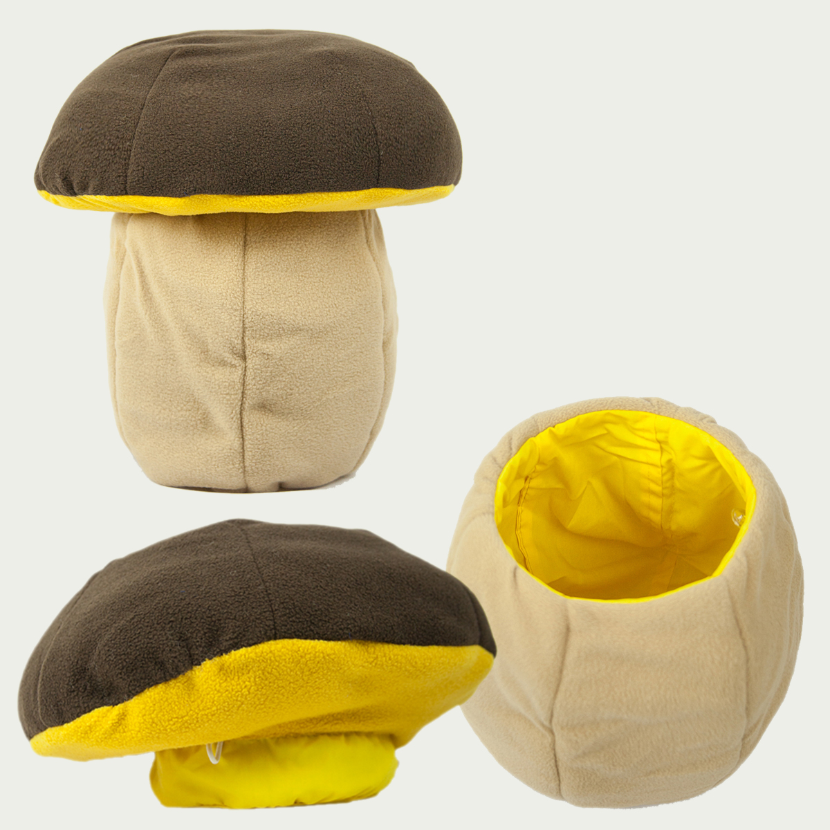 Материал: основа — флис 100% полиэстер, внутренний слой — изолон, набивка — синетпух, подклад — смесовая ткань 35% хлопка, 65% полиэстера. Комплектация: шляпка и ножка. Шляпка к ножке прикрепляется с помощью пуговок.
