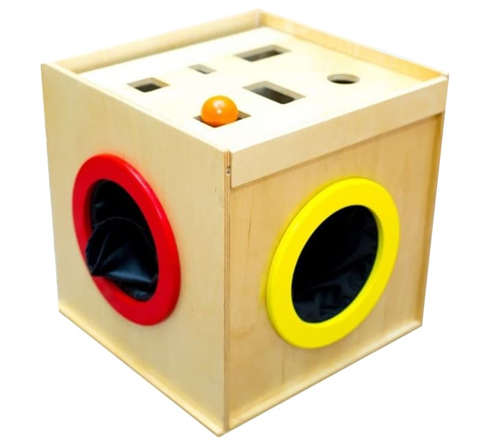 Изделие представляет собой ящик с дверцей, тремя тактильными ячейками и тремя съемными функциональными крышками, которые являются сортерами