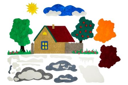 Домик 27*30см - 1шт., забор, дерево 2 шт., цветочки 10 шт., листики 10 шт., яблочки 10 шт., солнце, туча 3 шт., капли 10 шт., кроны деревьев 4 шт., снежные шапки от 1*1см до 20*12см.
