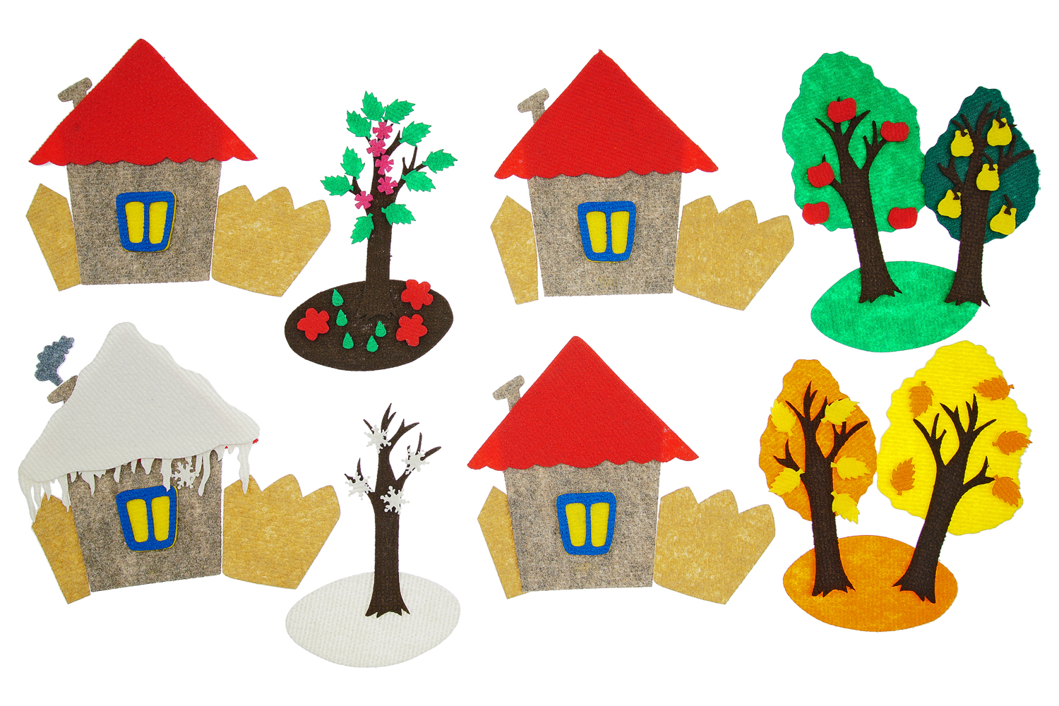 Игровое поле 25*35см, домики 4 шт. 17*15см , ствол дерева 2 шт., деревья с кронами 4шт., забор 4 шт., полянка перед домом 4 шт., цветочки, снежинки, листочки, груши и яблоки.Фигурки от 1*1см до 12*12см., поле 25*35