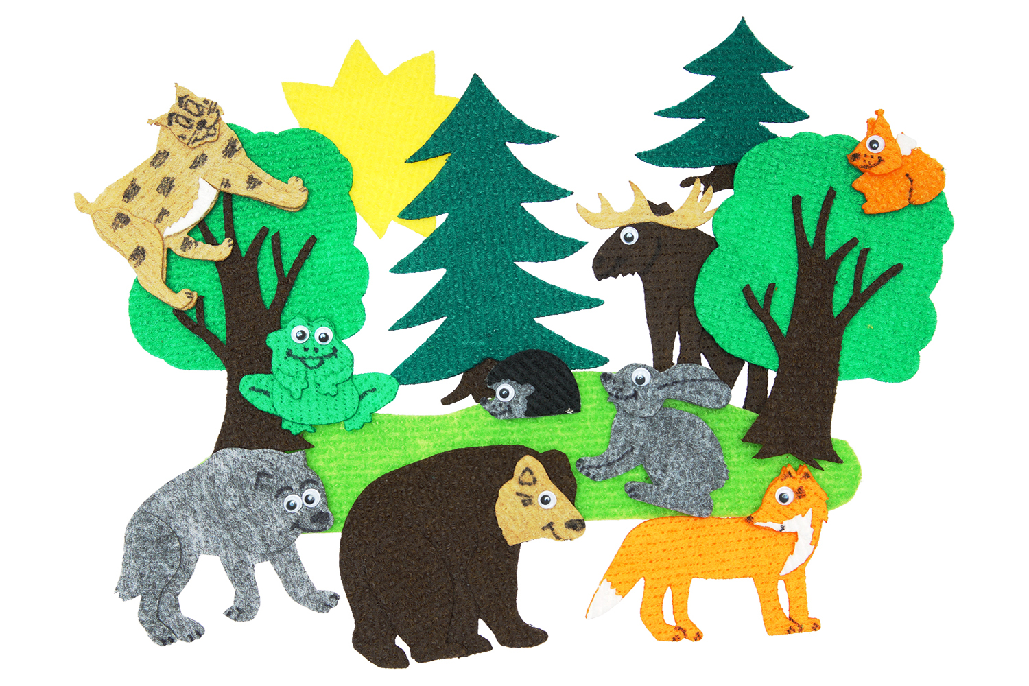 Поле 20*30см, дерево-2шт, елка-2шт.,солнце, медведь, лось, волк, лиса, рысь, заяц, еж, белка, лягушка. Фигурки 4,5*10см.