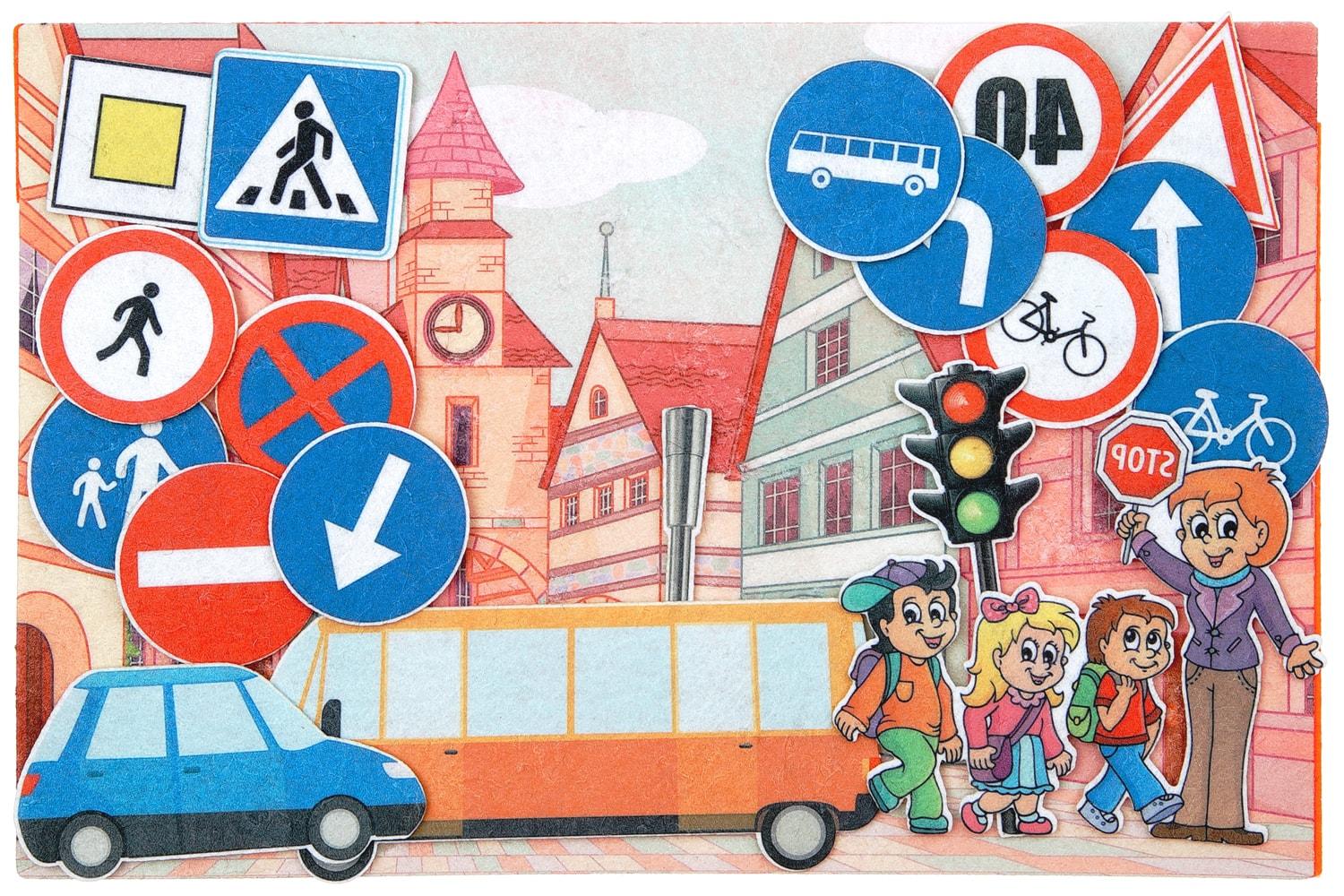 Игровое поле с карманом 28*20см, фигурки детей, дорожные знаки, светофор, автобус, машина. Фигурки от 3,5*3,5см до 13,5*5см