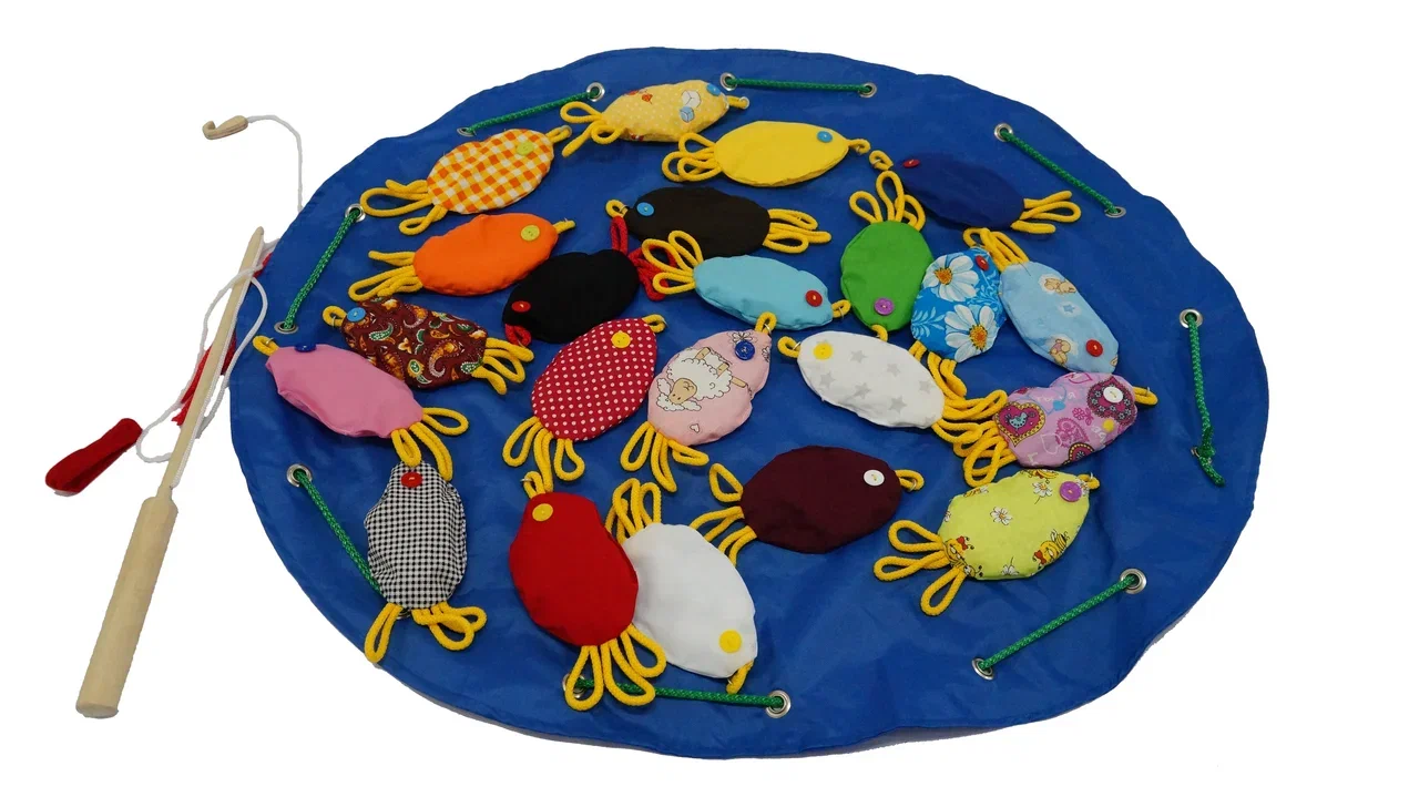 Материал: рыбки — хлопок 100%, шнур — полиэстер 100%, удочки — дерево, червячки — тафетта, 2 магнита, пруд — оксфорд — 100% полиэстер, заплечный мешок — смесовая ткань 35% хлопка, 65% полиэстера.