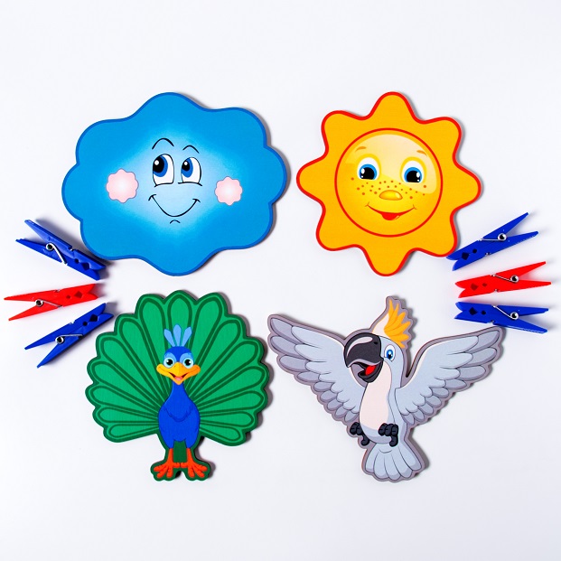Предложите ребёнку украсить героев. Сделайте солнцу лучики, тучке дождик, попугаю и павлину перышки. Обсудите, какие цвета подойдут героям.