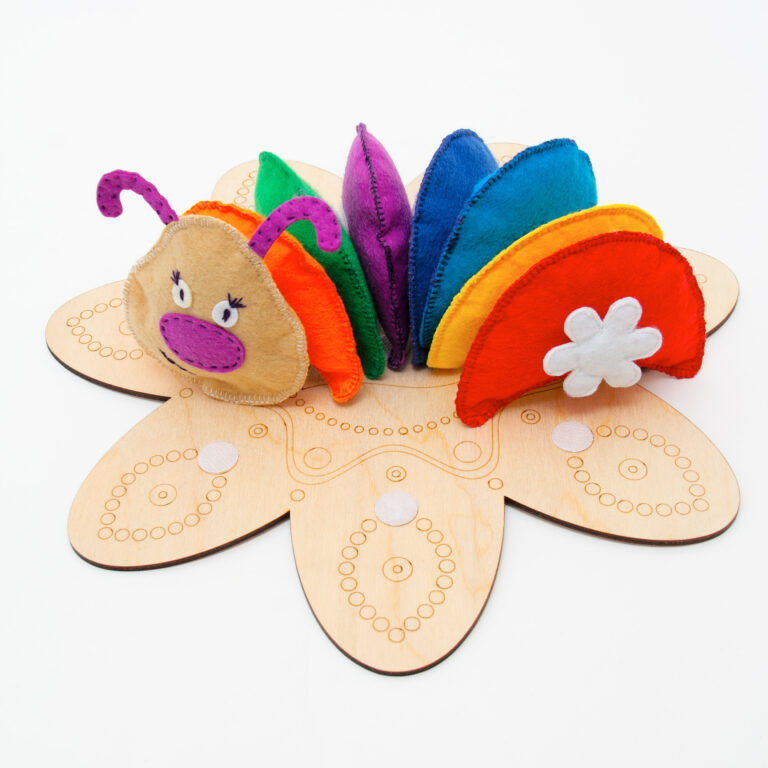 Гусеница, это яркая, приятная игрушка, которая состоит из объемных дисков разных цветов – туловище гусеницы и головы, на липах. Игрушка прикрепляется к деревянной платформе в форме цветка, с помощью лип. Фетровая игрушка способна привлечь внимание ребенка, удивить и подарить радость от игры. Это безопасный, прочный, теплый и приятный на ощупь материал. Самым важным в фетровых игрушках является огромный потенциал для сенсорного развития ребенка. Окружающий мир входит в сознание ребенка лишь через дверь органов чувств – зрение, слух, осязание, вкус и обоняние. Игрушки из фетра способны одновременно активизировать различные каналы восприятия ребенка, включенные в игровую деятельность: