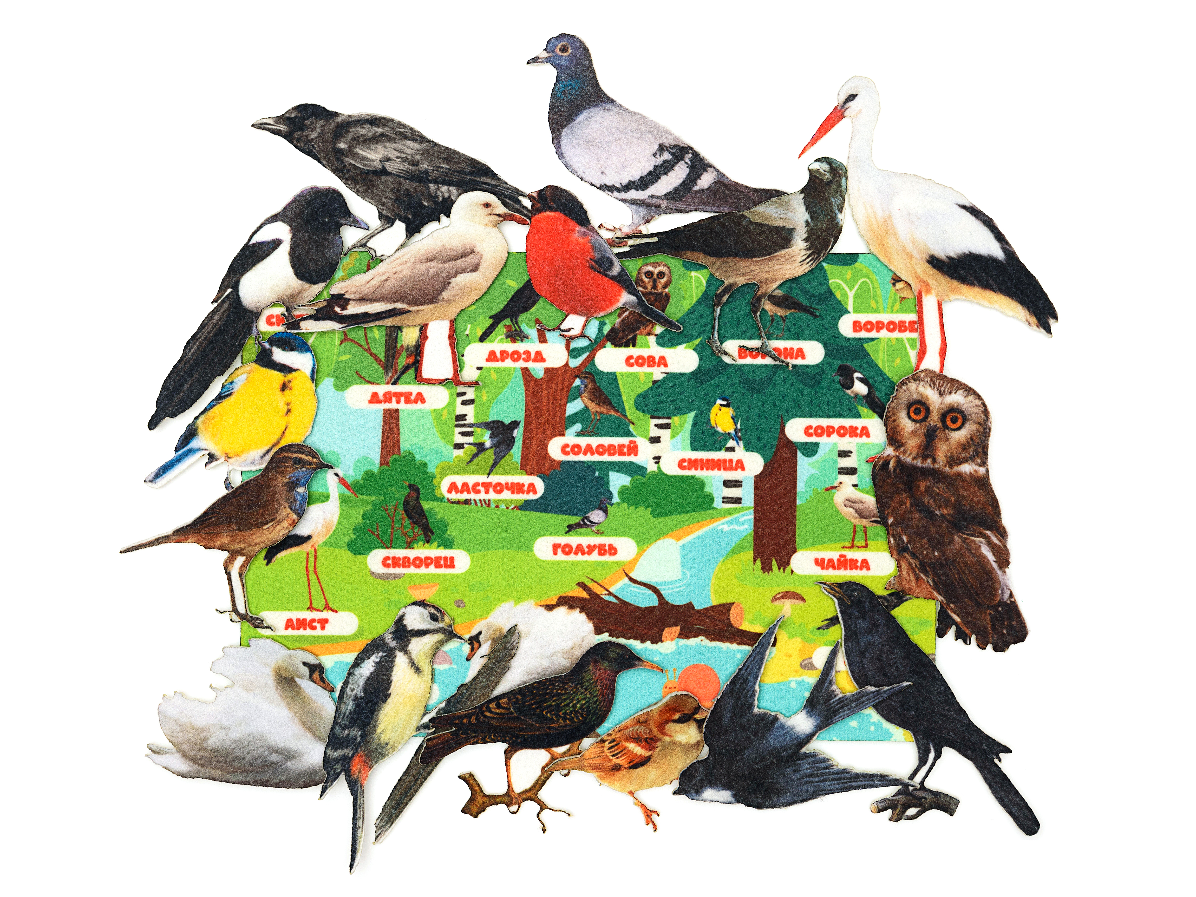Игровое поле с карманом 28*20см, фигрурки птиц на липучках от 5*5см до 15*9см. Фигурки на липучках.