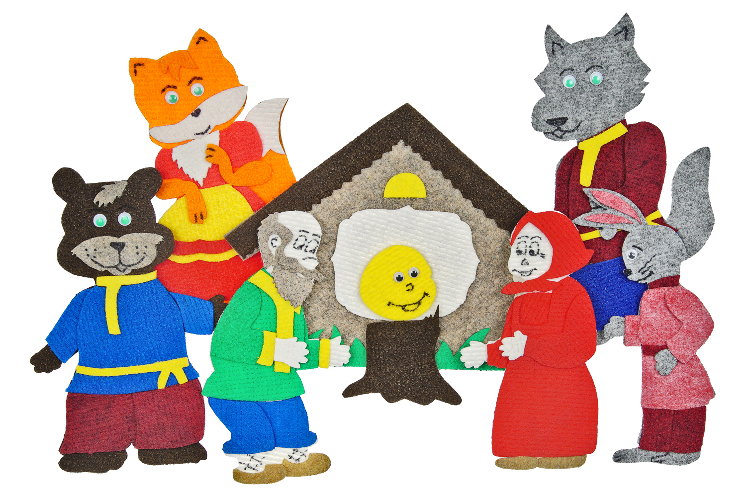 Изба, пенек, колобок, дед, бабка, медведь, волк, заяц, лиса. Фигурки от 5*5см до 20*20см. Поле 25*35см