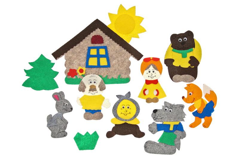 Изба, елка, солнце, пенек, куст, дед, баба, колобок, волк, заяц, медведь, лиса, игровое поле 25*35см. Фигурки от 4*4см до 25*25см