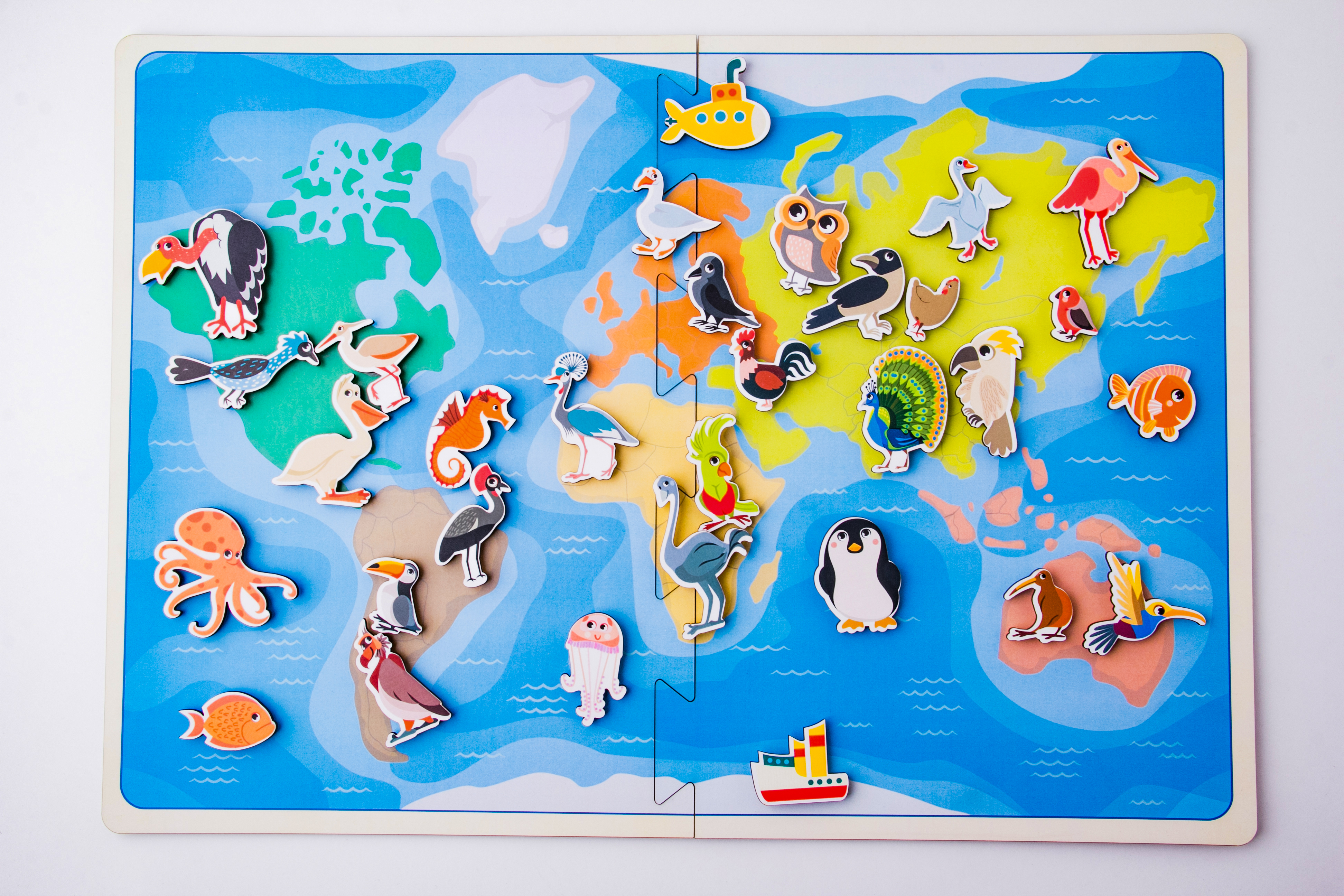 Отправляйтесь в Кругосветное путешествие с ребенком. Для начала рассмотрите фигурки птиц, складывая их на панель карты. Расскажите о птицах. О том, кто, где живет, об их повадках.