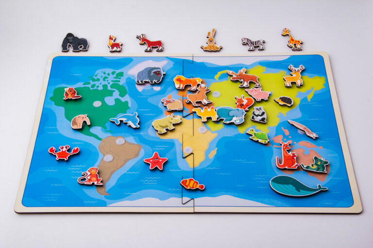 2. Кто, где живет. Для этой игры вам понадобится два (можно три )выпуска карт – липучек. Хищные животные, травоядные животные. И птицы. Соберите со всех двух карт всех животных. Перемешайте. Попросите ребенка выбрать из всех фигурок – только диких животных, которые живут в лесу. Пусть малыш поместит их в зеленую зону карты, и животных, которые живут в Африке. Поместим их в желтую зону карты. Почитайте ребенку сказку Корнея Чуковского Айболит. Такая игра – классификация прекрасно формирует понятийное, системное и логическое мышление. Таким же образом можно проводить и другие классификации. Например, отправьте всех морских животных – в океан.