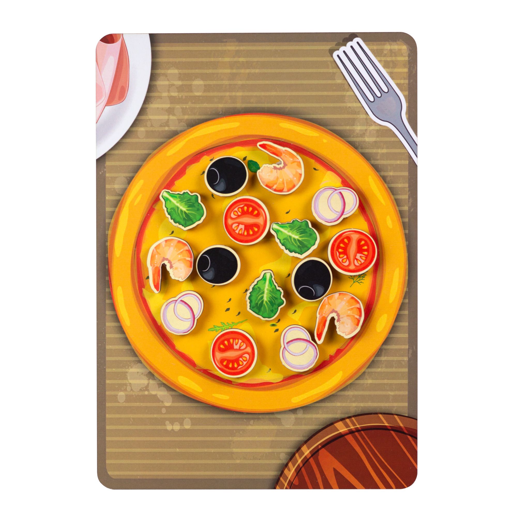 Фигурки ингредиентов пиццы на липах: маслины, листья салата, креветки, дольки лука и помидор – по 3 шт. каждого вида ингредиента.