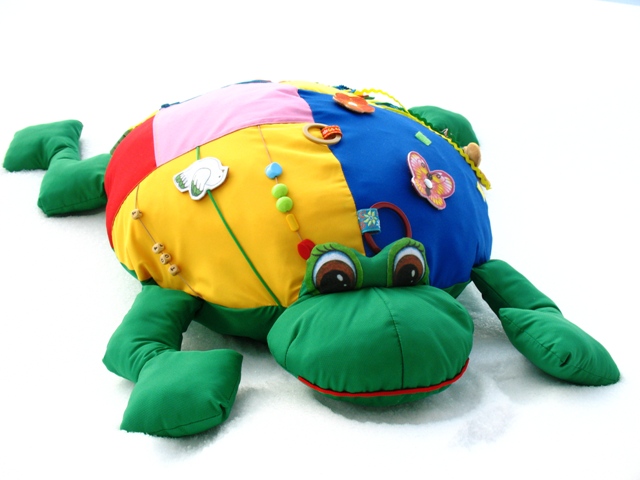 На ее спинке – яркие цветные сектора (изучение цветов), различные застежки и навесные элементы (развиваем мелкую моторику).