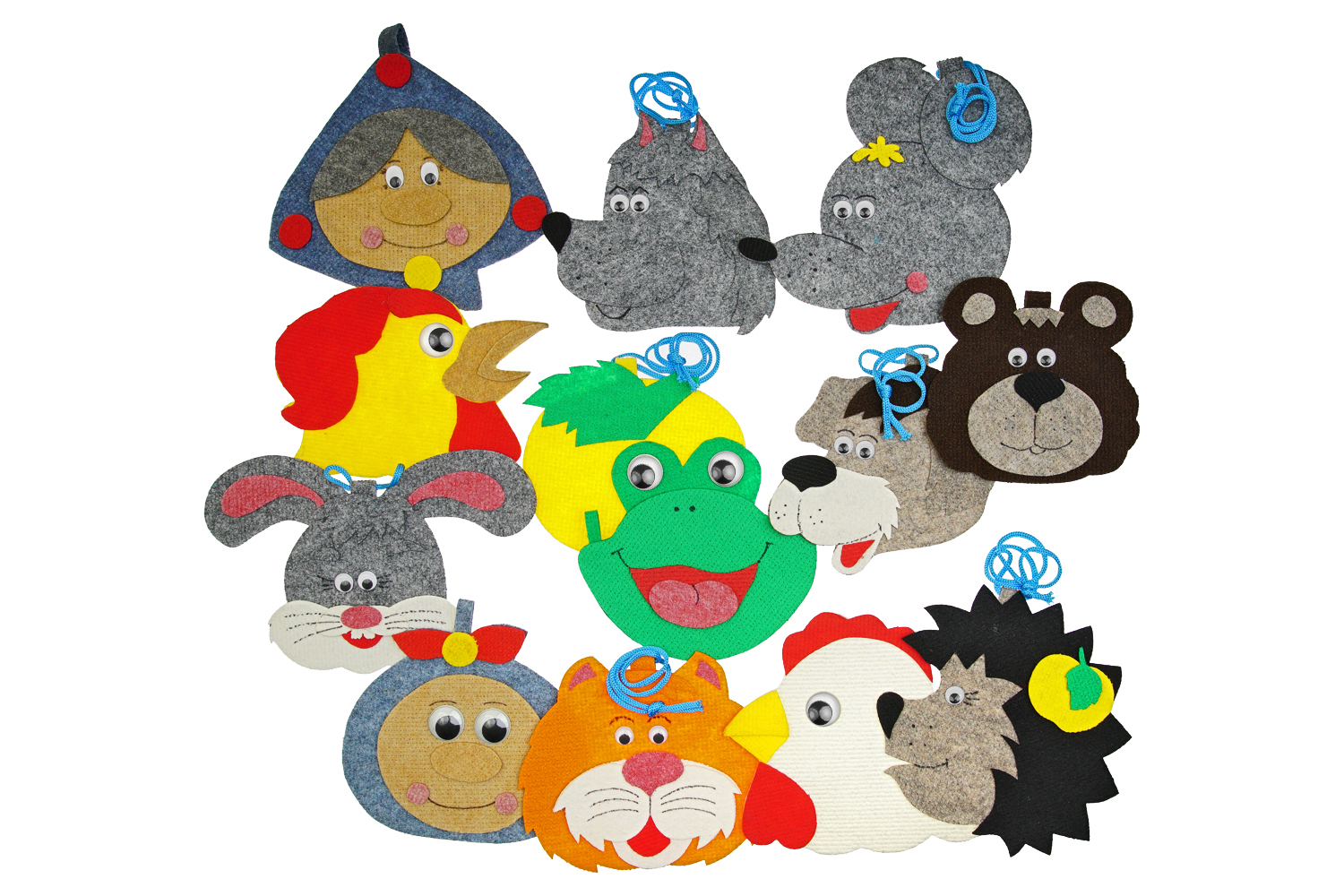 Дед, бабка, внучка, мышка, собачка, кот, заяц, ежик, лягушка, лиса, волк, петух, курица, колобок, медведь, репка.Фигурки 25*25см.