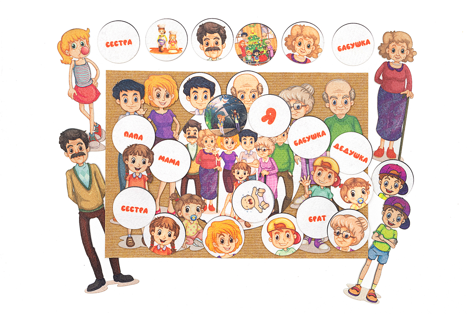 Игровое поле 25*35см, фигурки семьи, фигурки названий, фигурки портрет, фигурки занятия с детьми, лепестки. Фигурки на липучках.